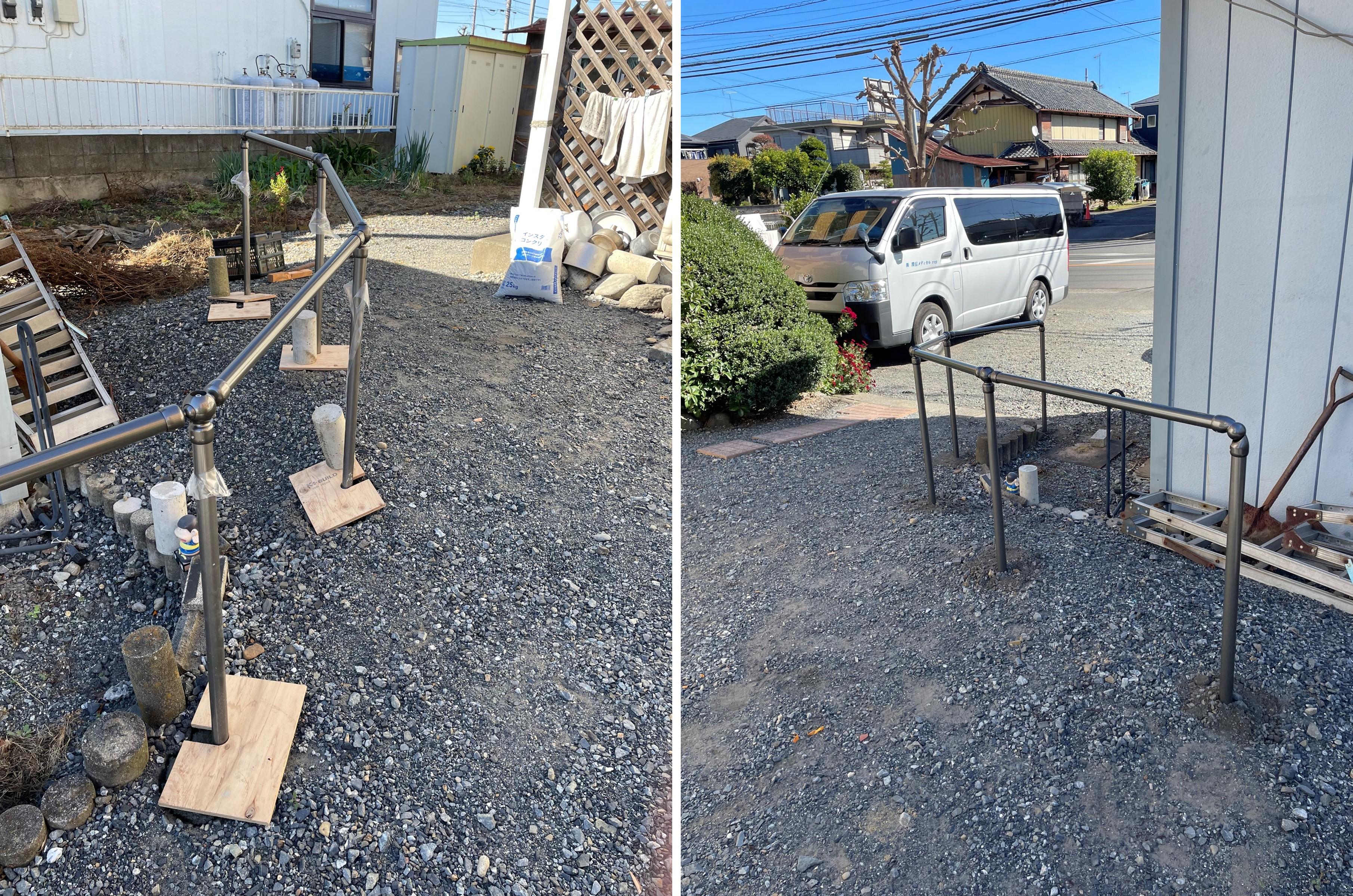 本日は外手摺2本です。タイルにアンカー打込みとコンクリート埋込みで取付です。