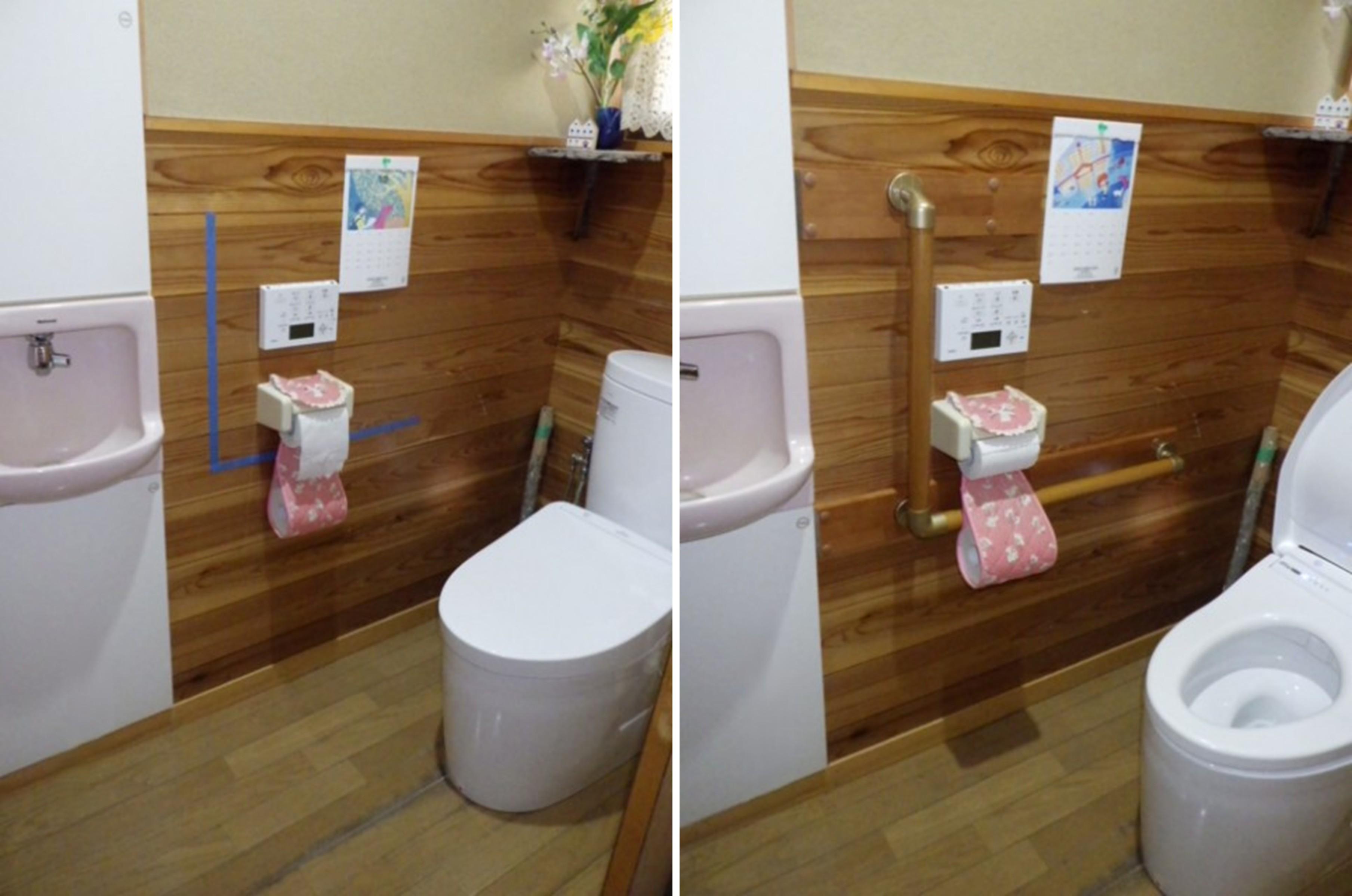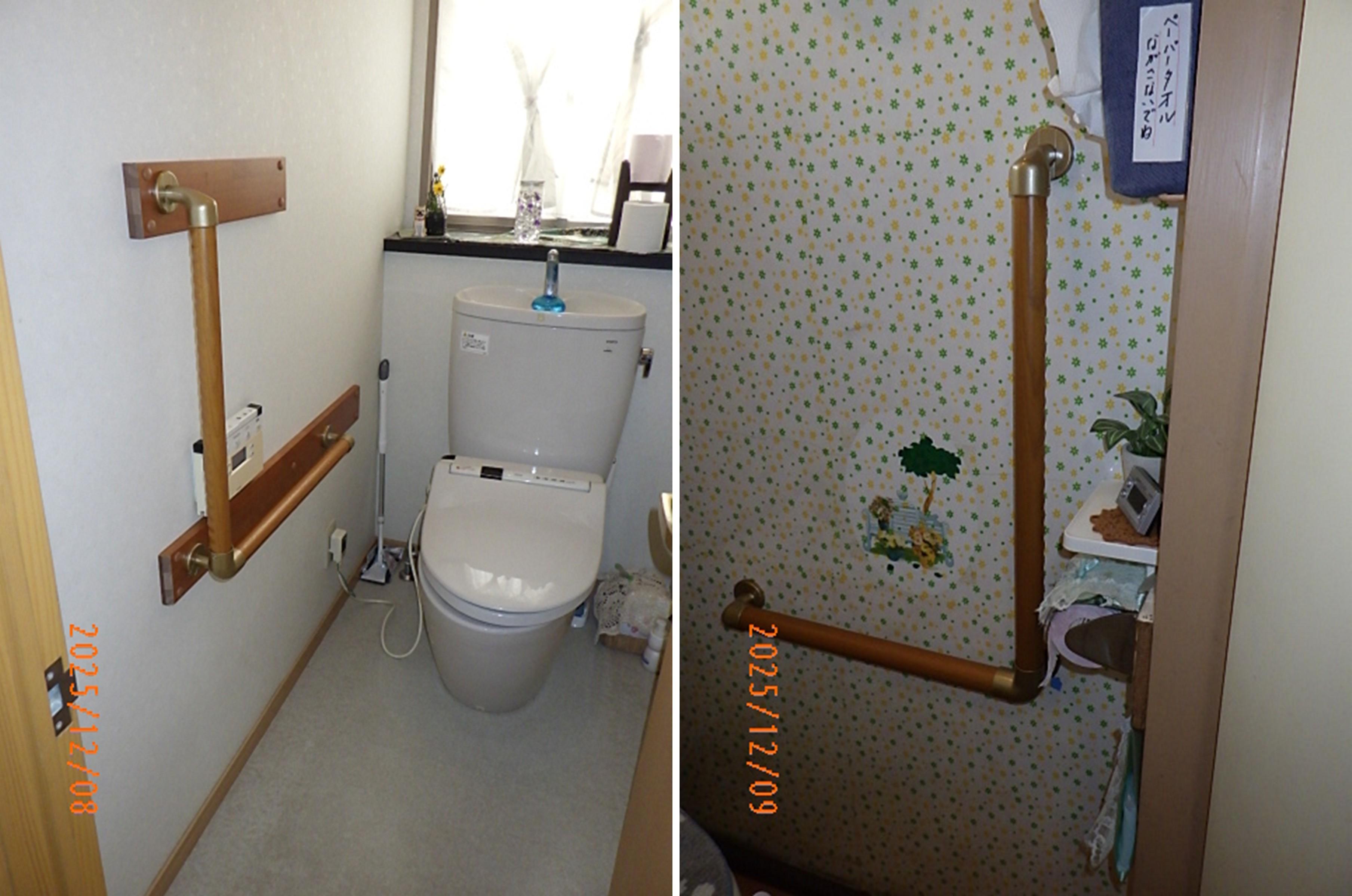 さて、昨日の玄関外手摺に続いて、こちらトイレ手すりも結構続けて取り付けてます。