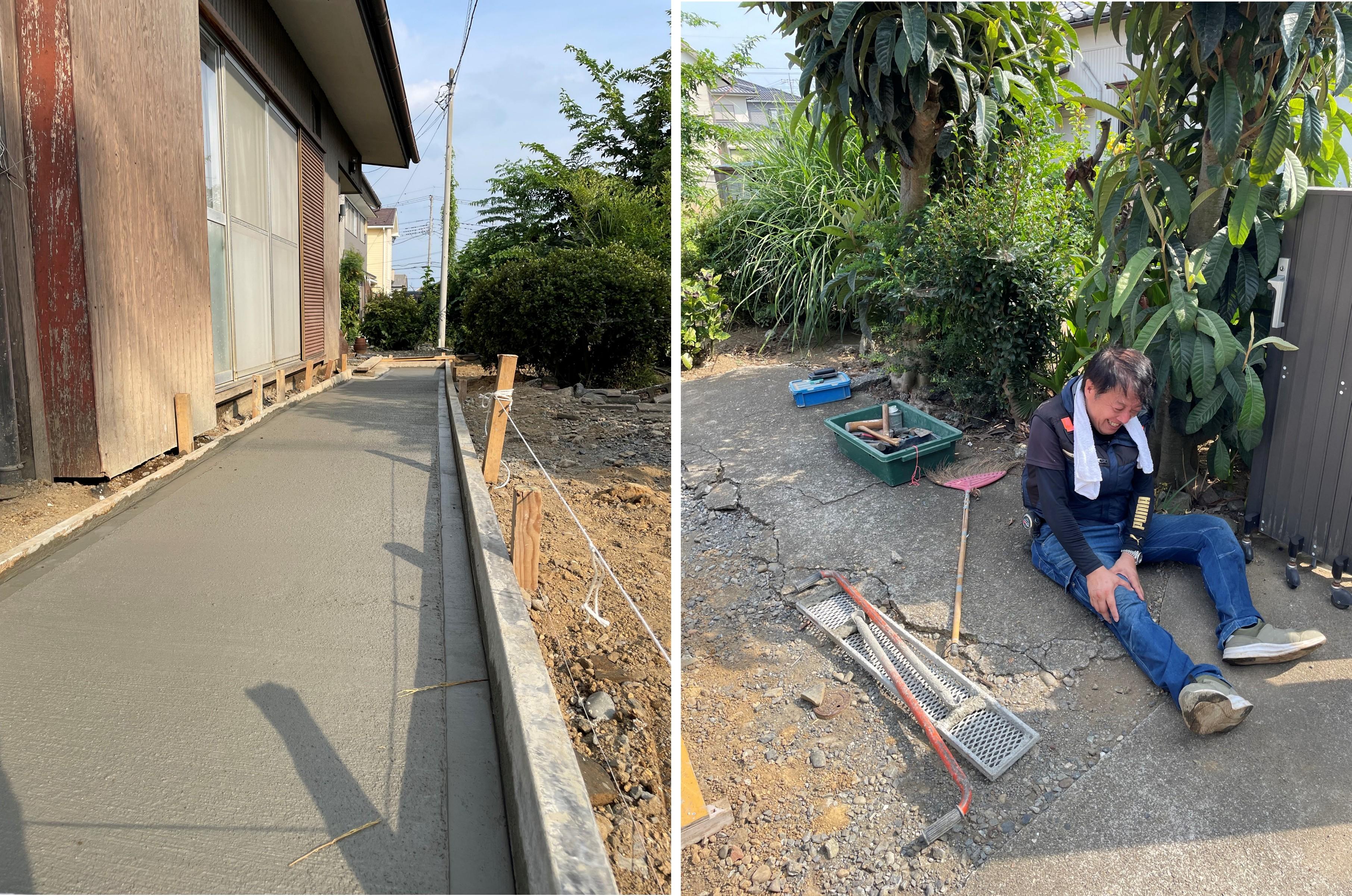 社長も同僚Kさんも汗かきかき4人がかりで無事に打設完了です。