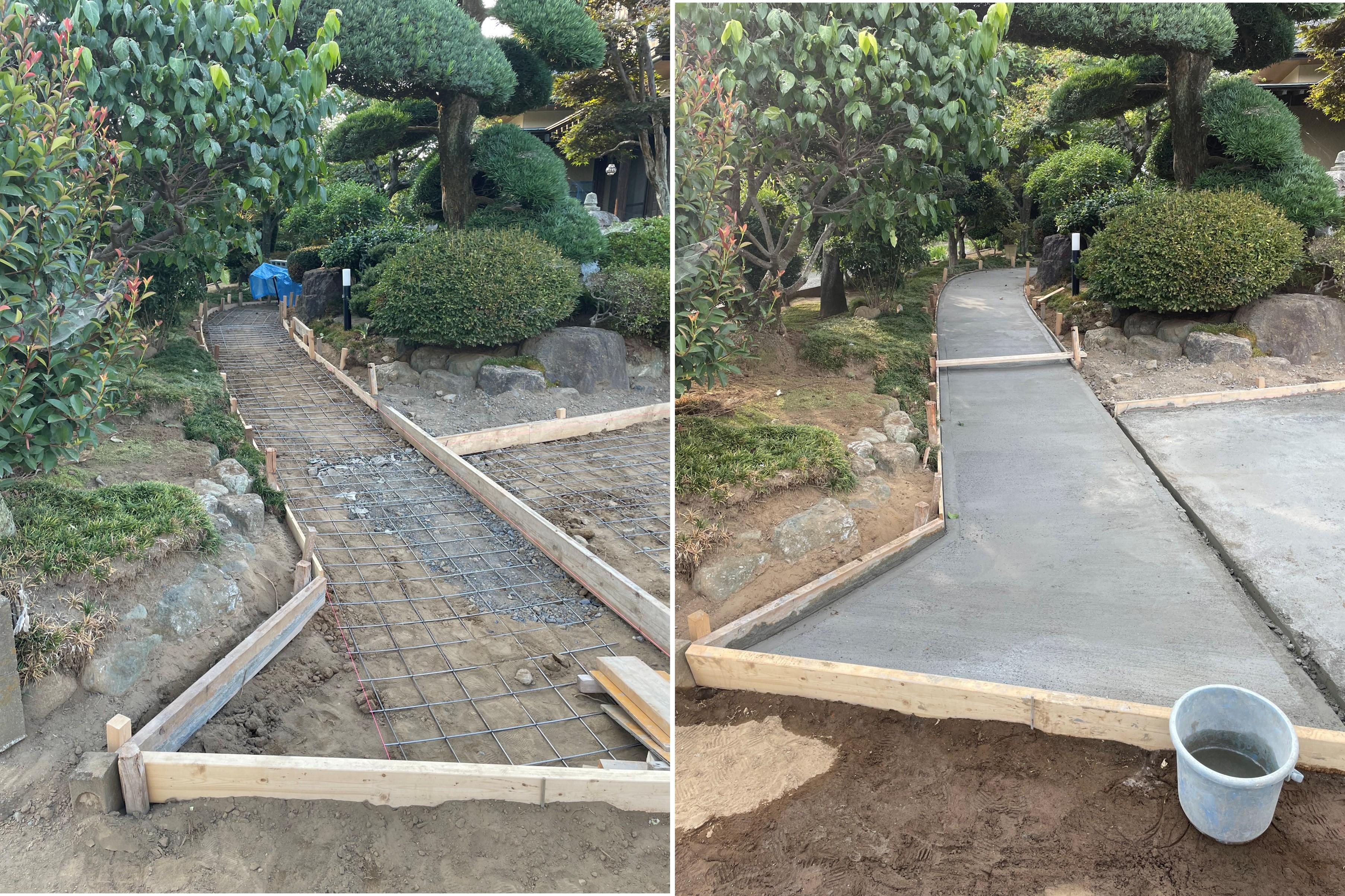 先日工事しましたコンクリート踏み台付き手すりの外枠撤去と仕上げ作業!大先輩Yさんの丁寧なバリ取りとモルタル均しを背中越しに学んでいます。